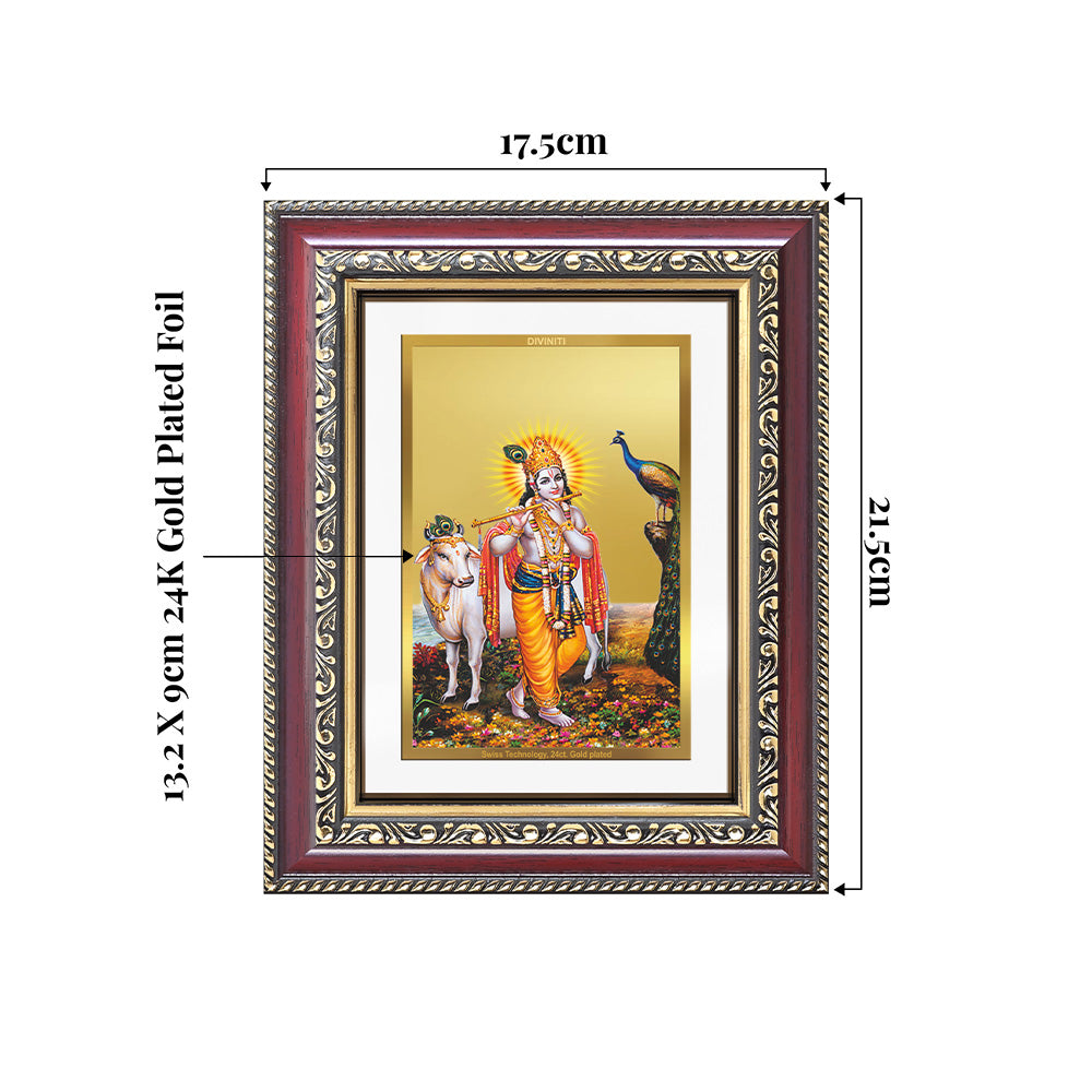 This exquisite Photo Frame portrays Lord Krishna standing gracefully with his flute, accompanied by Surbhi the wish-fulfilling divine cow under a celestial backdrop. Crafted using high-precision Swiss embossing technology, every detail glows with spiritual energy and rich craftsmanship. The 24K gold plating ensures lasting brilliance, making this Photo Frame a treasured centerpiece for your pooja room, living space, or as a heartfelt devotional gift that brings blessings of love, prosperity, and inner peace.