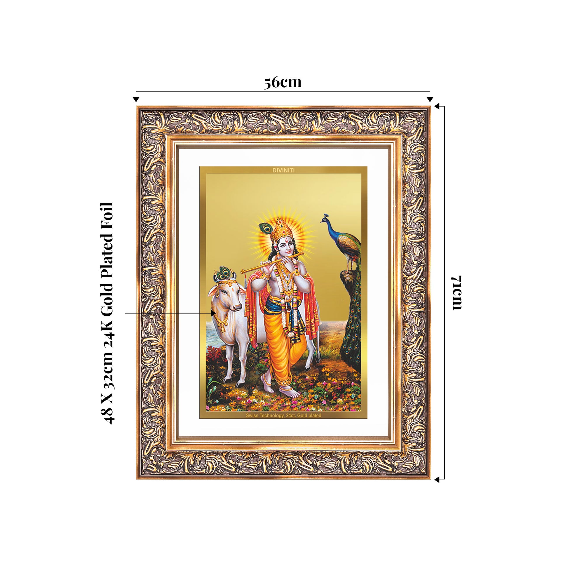 This exquisite Photo Frame portrays Lord Krishna standing gracefully with his flute, accompanied by Surbhi the wish-fulfilling divine cow under a celestial backdrop. Crafted using high-precision Swiss embossing technology, every detail glows with spiritual energy and rich craftsmanship. The 24K gold plating ensures lasting brilliance, making this Photo Frame a treasured centerpiece for your pooja room, living space, or as a heartfelt devotional gift that brings blessings of love, prosperity, and inner peace.