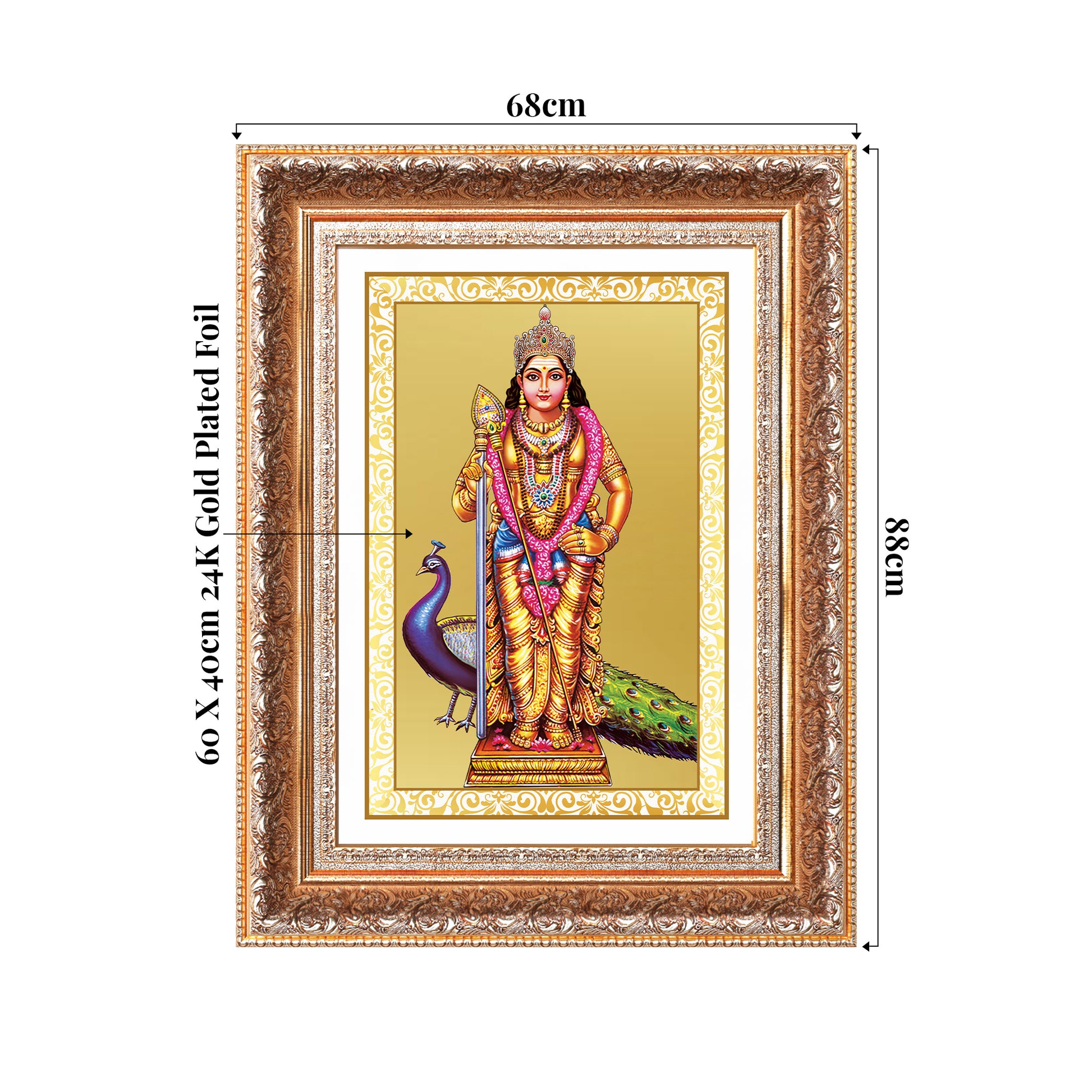 This sacred Photo Frame portrays Lord Murugan in his majestic form, holding the divine spear (Vel) and riding his celestial peacock, symbolizing courage, knowledge, and triumph over evil. Crafted with precision using advanced Swiss embossing technology, every intricate detail shines through in a radiant 24K gold finish. An ideal addition to your pooja room or as a divine gift, this Photo Frame brings blessings of strength, protection, and spiritual elevation into your home.