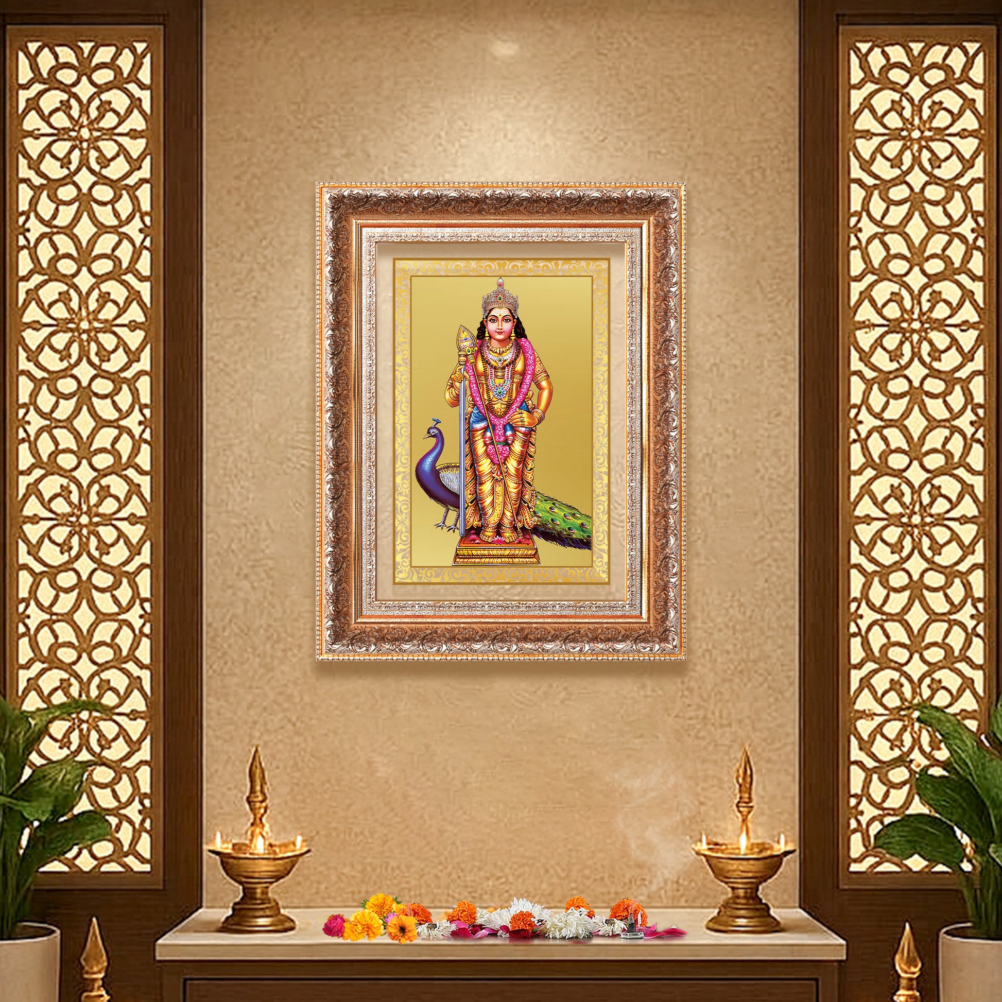Invoke the valor, wisdom, and divine grace of Lord Murugan, the revered son of Lord Shiva and Goddess Parvati, with this exquisitely crafted Wall Mount Photo Frame in 24K gold-plated foil. Revered also as Kartikeya, Skanda, and Subramanya, Lord Murugan is the embodiment of youthful energy, spiritual victory, and the destroyer of negative forces.