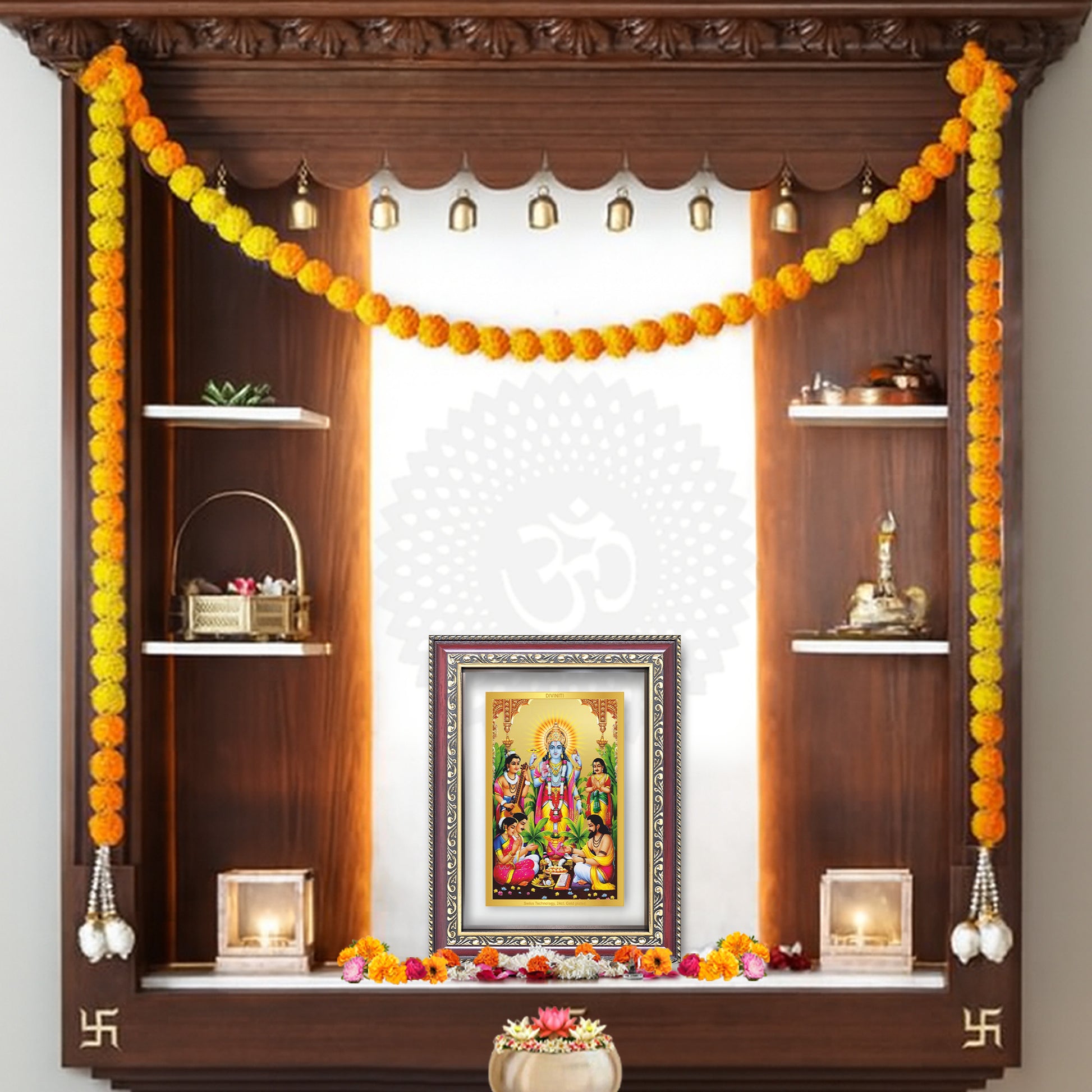 Invoke the sacred blessings of Lord Satyanarayana, the benevolent form of Lord Vishnu, worshipped as the embodiment of truth, abundance, and divine grace, with this beautifully crafted Wall and Tabletop Photo Frame in 24K gold-plated foil. Revered especially during the Satyanarayan Katha and Puja, He is believed to fulfill wishes, remove hardships, and bestow prosperity and harmony in household life.
