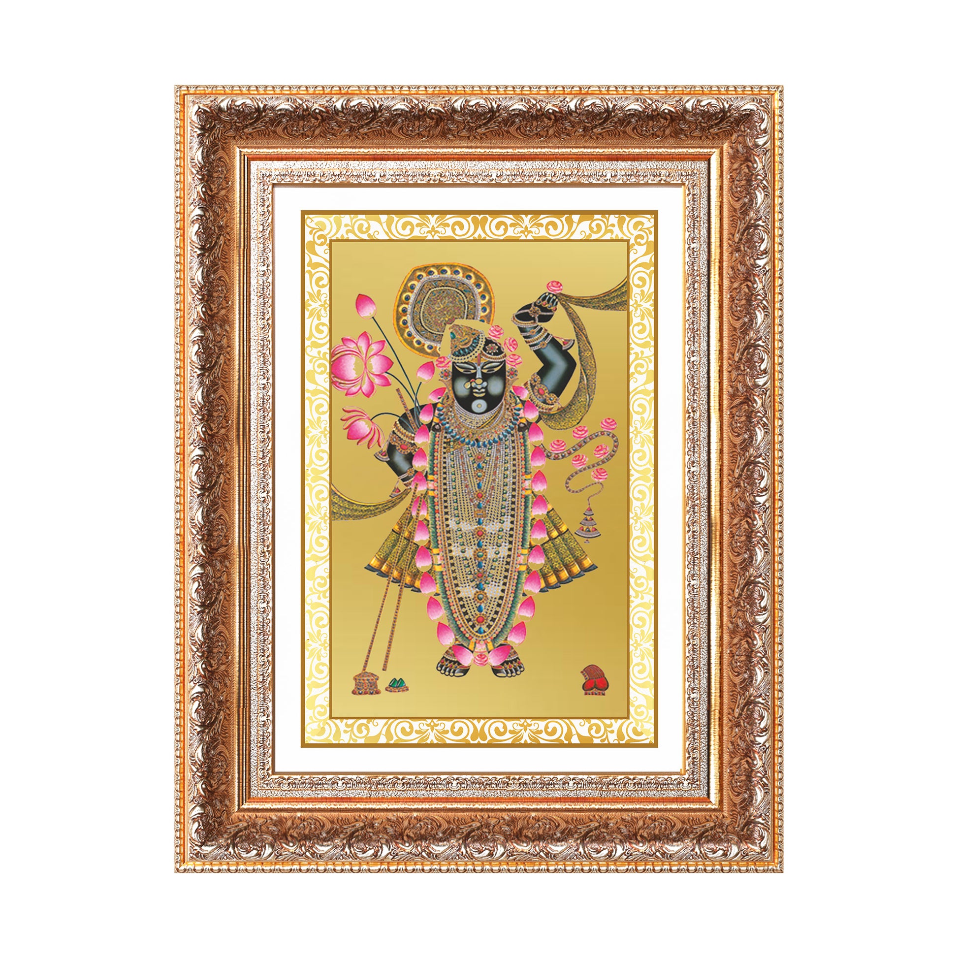 Celebrate the majestic and childlike divinity of Lord Shrinathji, the revered form of Lord Krishna manifested as a young cowherd lifting Govardhan Hill, with this beautifully crafted Wall Mount Photo Frame in 24K gold-plated foil. Worshipped with great devotion in Nathdwara, Rajasthan, Shrinathji is the central deity of the Pushtimarg sect, representing grace, protection, and unconditional divine love.