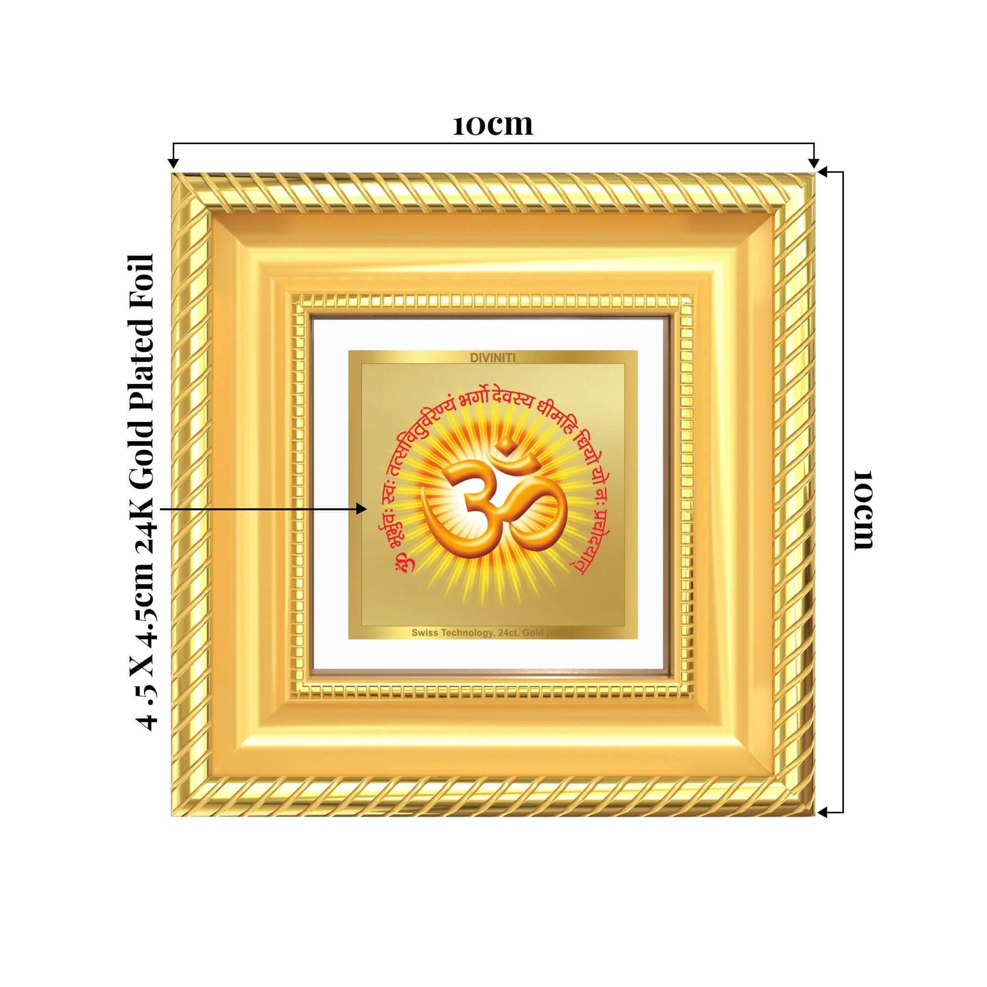 Invoke wisdom, purity, and spiritual enlightenment with this elegant Om & Gayatri Mantra frame, beautifully showcasing the sacred sound of Om alongside the revered Gayatri Mantra. Symbolizing divine knowledge, inner peace, clarity of thought, and protection, this sacred artwork inspires mindfulness and spiritual growth. Expertly crafted in 24K gold plated foil, the frame blends refined artistry with deep spiritual significance. Ideal for home altars, meditation spaces, study areas, office desks, or displays, it brings blessings, serene energy, and divine grace to every space it adorns.